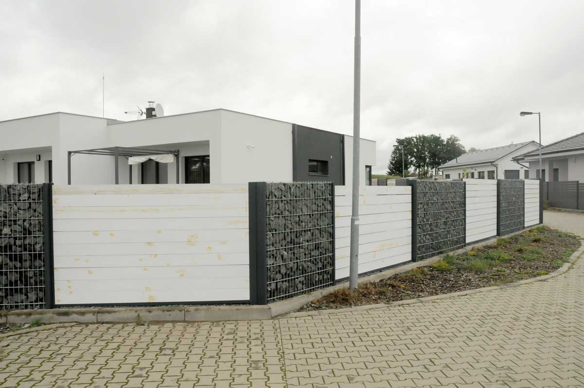 Oplocení z gabionů v kombinaci se dřevem u RD ve Vlašimi